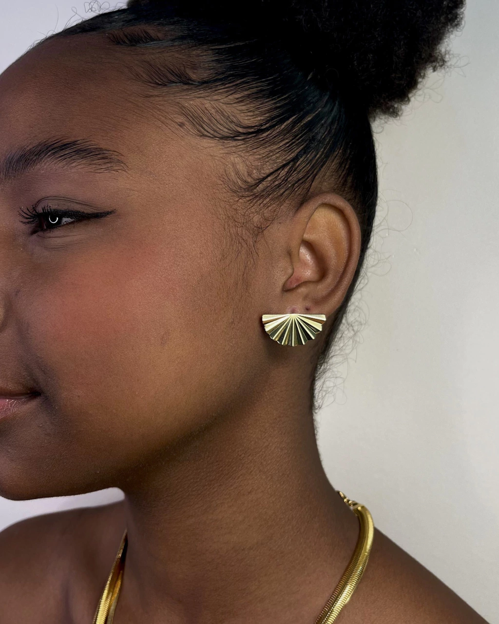 Este brinco com design em formato de leque, é banhado a ouro 18K, garantindo um brilho intenso e duradouro que valoriza qualquer produção. Seu tamanho compacto o torna ideal para o uso diário, trazendo um toque de elegância sem perder a leveza.